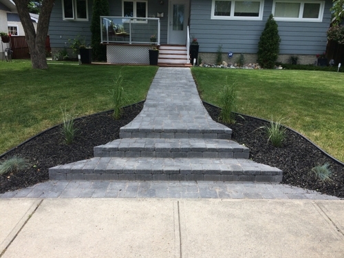 This was a fun project. The original design was just to a rock bed and plants, but the client did not like how small that design made the walkway look. We then settled on a fun and I think very elegant looking solution to extend the walkway width by a foot on each side by installing a product called Dimensions 6x12 in charcoal on either side in a soldier course pattern, then using 20mm limestone for the rock bed to add contrast. The final result is very striking and I like it a lot.